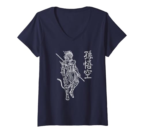 Sun Wukong Monkey King Chinese Characters Letters V-Neck T-Shirt, Women, Navy, S