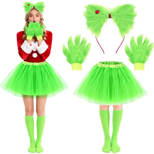4 PCS Green Monster Christmas Costume Women Girls, Fuzzy Bow Headband Fluffy Gloves Green Tutu Knee High Socks, Women Monster Santa Costume Accessories for Christmas Outfits Holiday Party Cosplay
