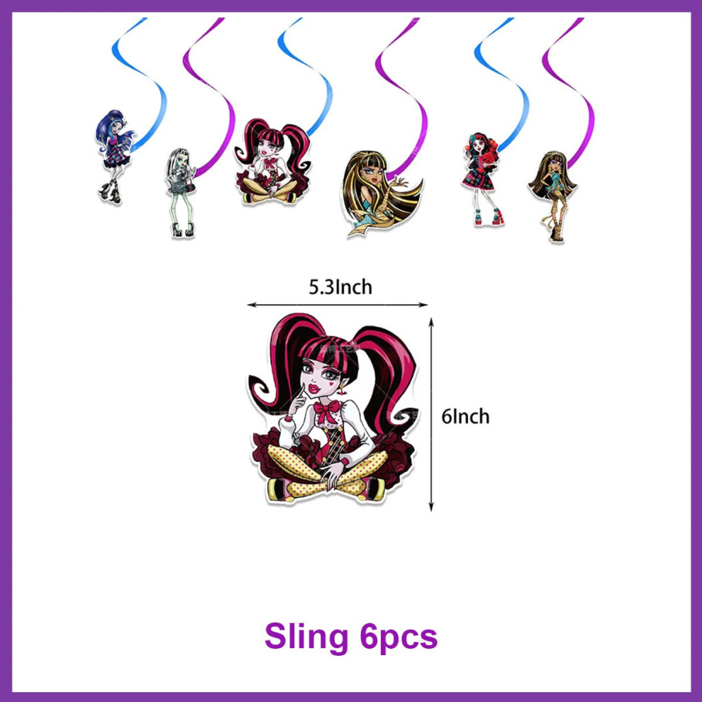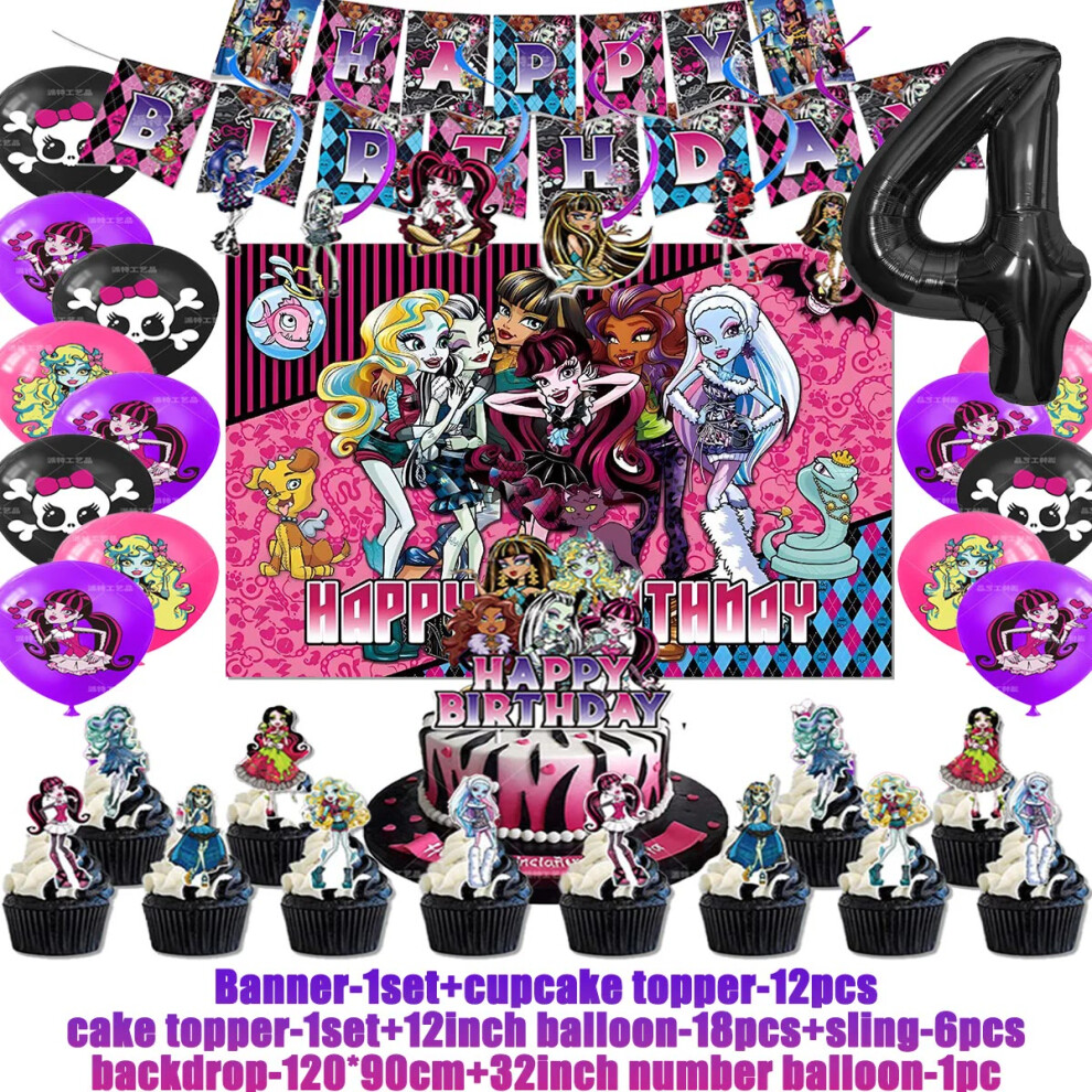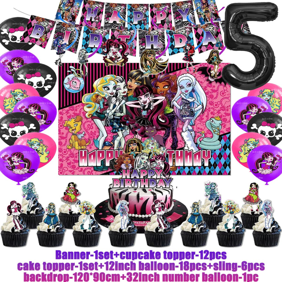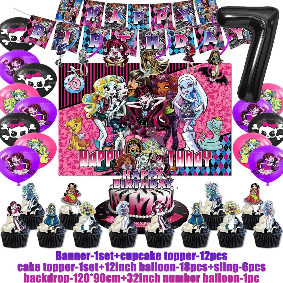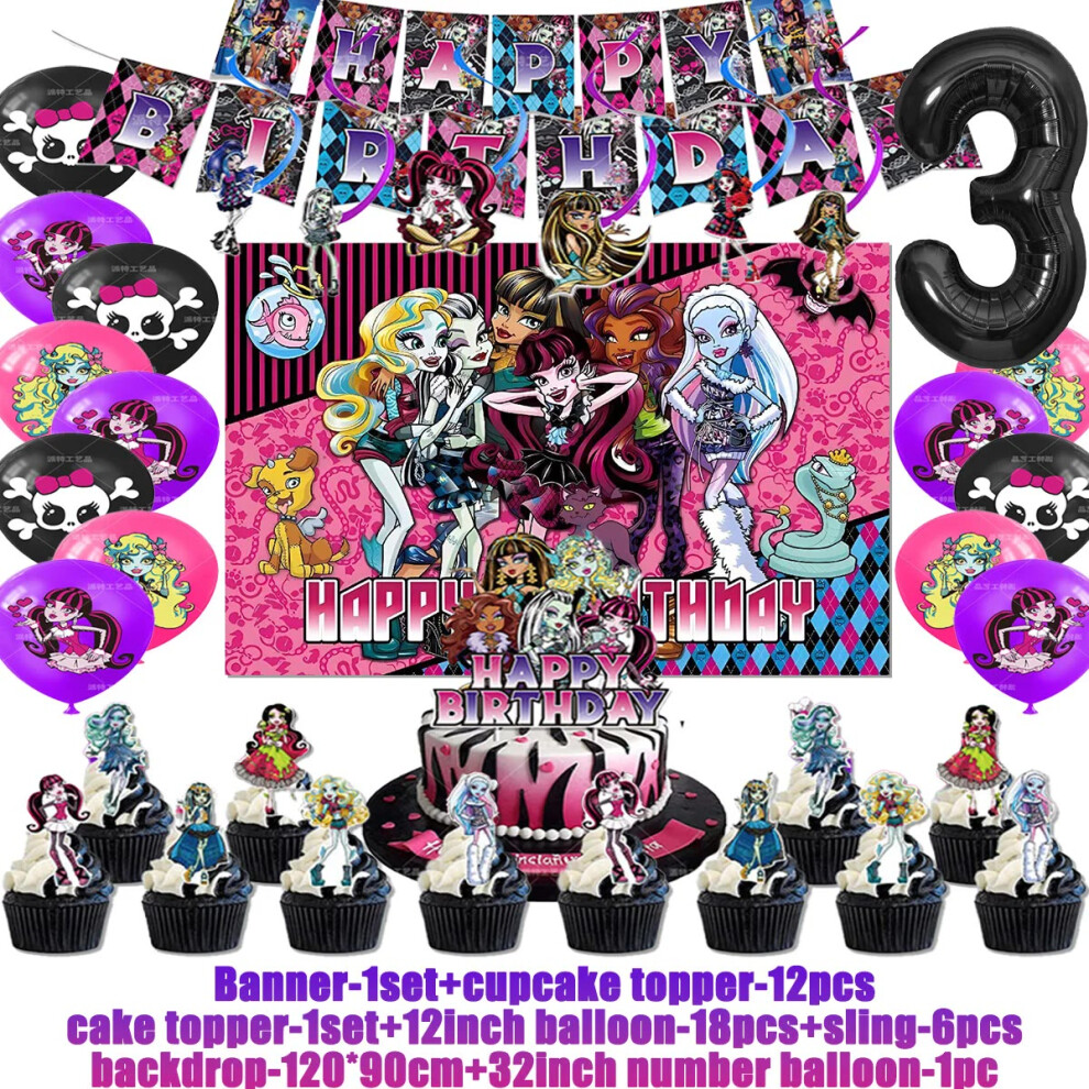 (backdrop 1pcs) Monster Doll Spirit High School Birthday Party Supplies Balloon Tablecloth Disposable Tableware Set Kids Baby Shower Party Deco
