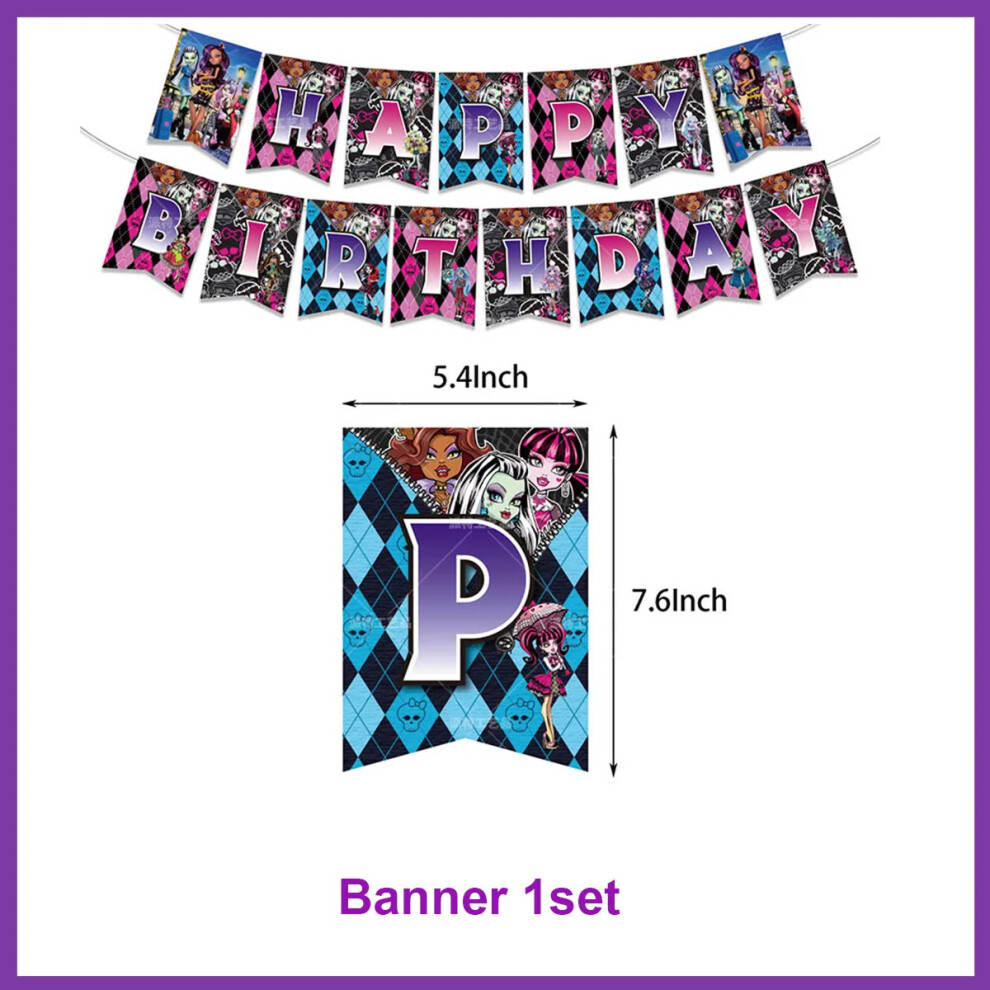(banner-1set, Other) Cartoon Monster Spirit High School Theme Birthday Party Disposable Tableware Doll Balloons Plates Cup Child 1st Birthday Gifts