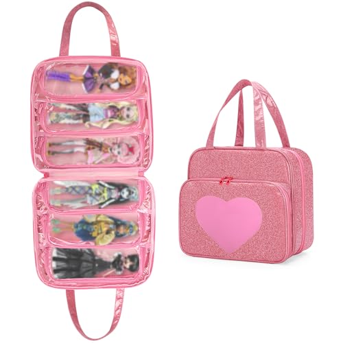 LoDrid Doll Case Compatible with Monster High Dolls with 6 Transparent Pockets for Display and Storage, Tote Bag with Front Pocket and Handle, Pink, Bag Only