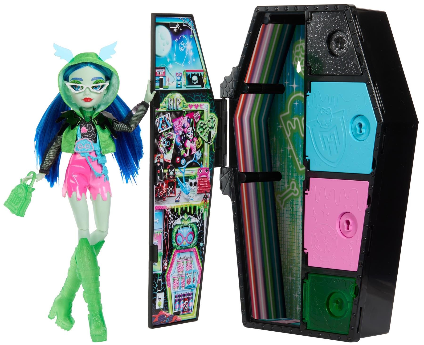 Monster High Doll and Fashion Set, Ghoulia Yelps Doll, Skulltimate Secrets: Neon Frights, Dress-Up Locker with 19+ Surprises, HNF81
