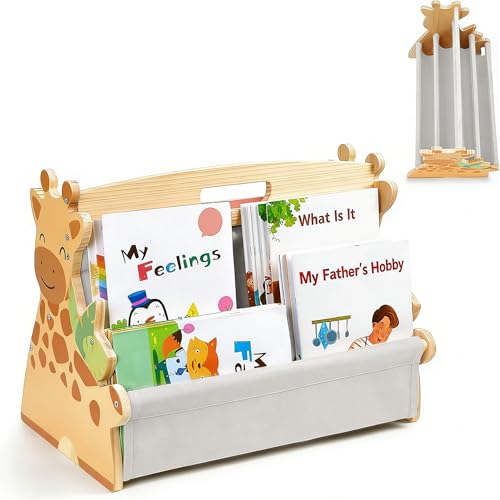 Kids Bookshelf, Wooden Double-Sided Childrens Bookcase Montessori Bookshelf Sling Book Rack with Canvas Storage, Portable Toddler Bookcase Book Display Shelves for Nursery Bedroom Playroom, 42x25x37cm