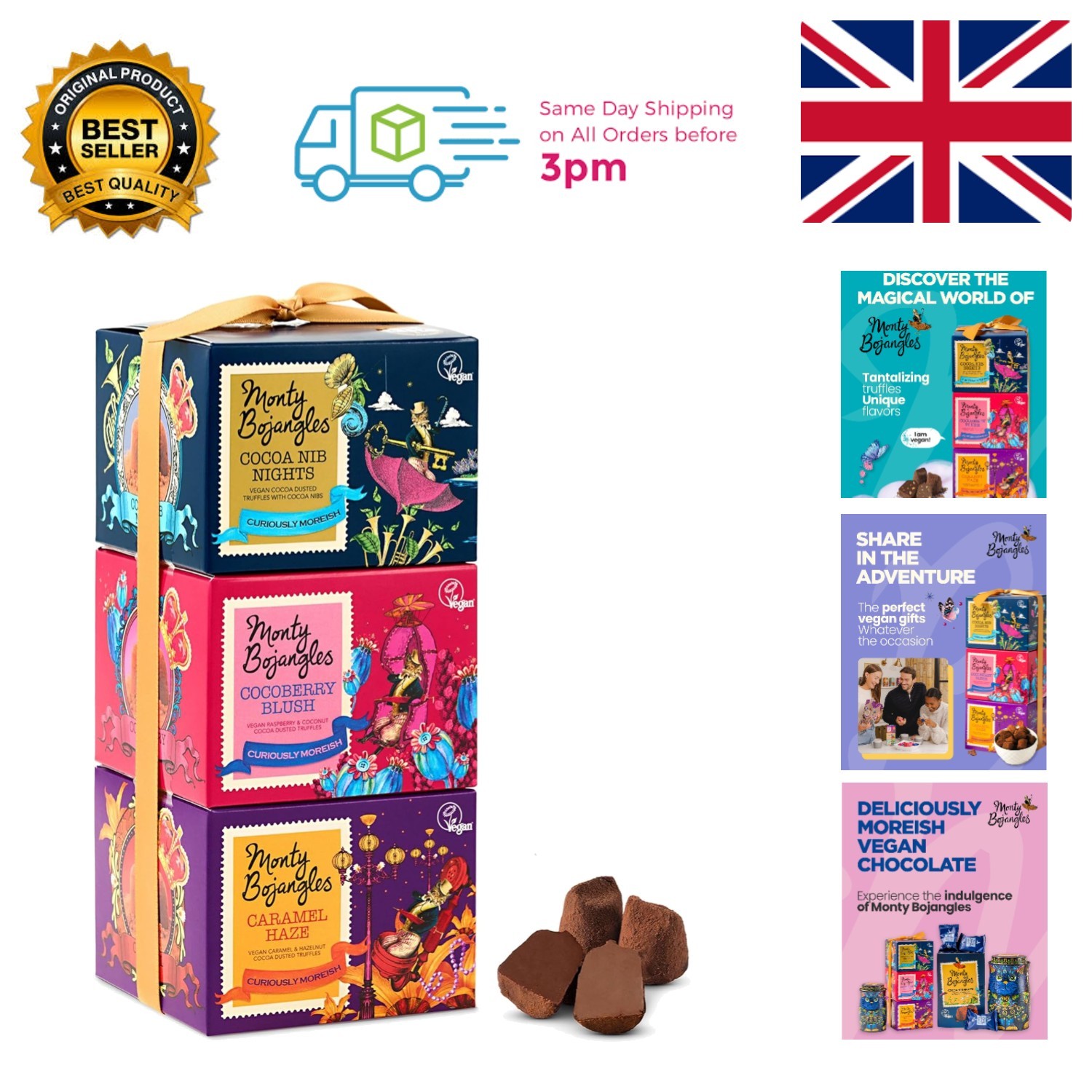 Monty Bojangles Vegan Tower | 3 Gift Boxes - Caramel Haze, Cocoa Berry Blush, Nib Nights | Cocoa Dusted Chocolate Truffles, 300g (3 x 100g Gift Pack)