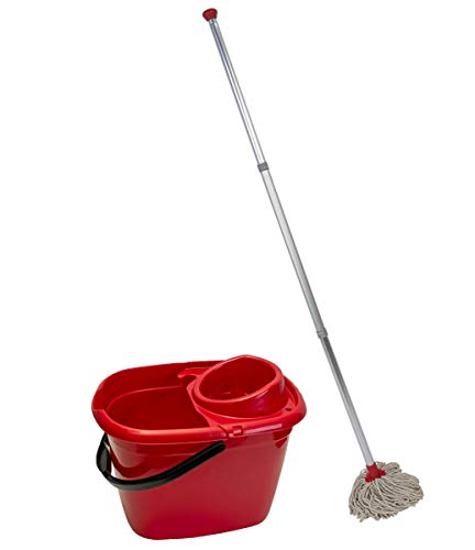 Abbey Professional Mop and Bucket Set Heavy Duty with Wringer and Two Traditional Cotton Mop Heads for Cleaning Floors – Strong Aluminum Mop Handles – Mop Bucket Capacity 12L with Pouring Lip (Red)