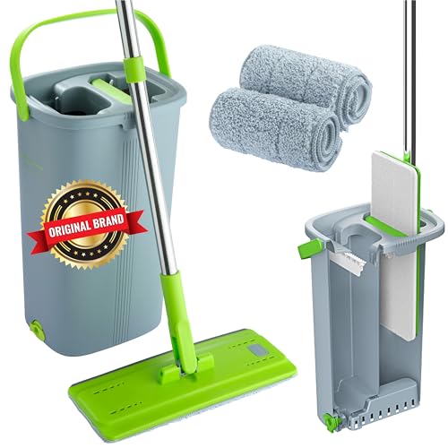 Mop and Bucket Set - Easy Gleam Floor Flat Mop with 2-Chamber Bucket - Microfibre Pads and Stainless Steel Handle - Compact and Lightweight for Efficient Cleaning - Green