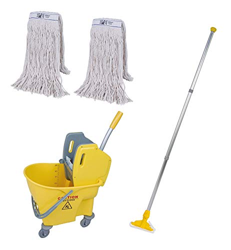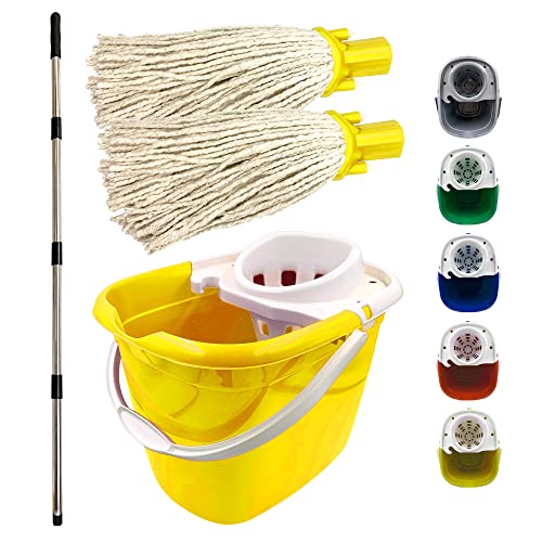 Abbey Professional Mop and Bucket Set Heavy Duty with Wringer and Two Traditional Cotton Mop Heads for Cleaning Floors – Strong Aluminum Mop Handles –Mop Bucket Capacity 12L with Pouring Lip (Yellow)