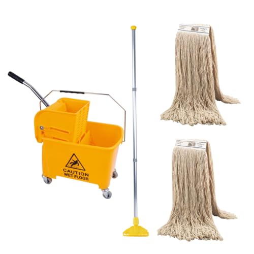 Floor Mop and Bucket Set - 2PC Mops for Cleaning Floors with Bucket, Pure Yarn Mop Heads and Heavy-Duty Mop Bucket, Industrial Mop and Bucket for Domestic and Commercial Use (Yellow)