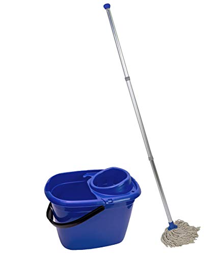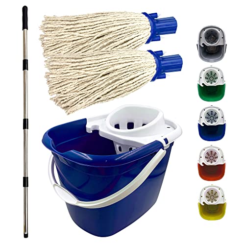 Abbey Professional Mop and Bucket Set Heavy Duty with Wringer and Two Traditional Cotton Mop Heads for Cleaning Floors – Strong Aluminum Mop Handles – Mop Bucket Capacity 12L with Pouring Lip (Blue)