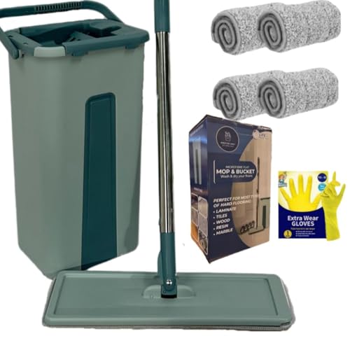 SWISSPACK *Bundle *Floor Mop and Bucket Set(Gloves Inc) − Easy and Simple Squeeze Mop Bucket, Flat Mop with 4-Pack Replacement Machine Washable Microfibre Mop Pads for All Floors Types (Green)