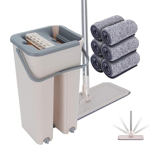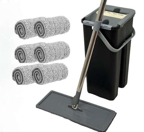 VOUNOT Flat Mop and Bucket set, 2-in-1 Hands Free Squeeze Mop User-Friendly Design, Includes 6 Reusable Microfiber Mop Pads, Grey