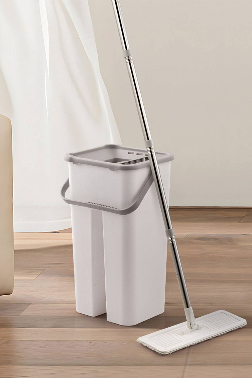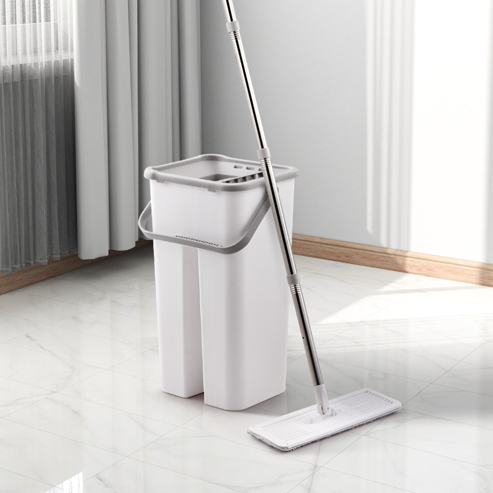 Mop and Bucket Set, Microfibre Flat Mop for Wet & Dry with Stainless Steel Handle, Twin Chamber Bucket Suitable for All Floor (White)