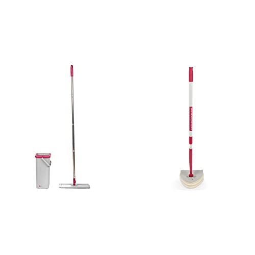 Kleeneze KL062253EU Space Saving Mop and Bucket Set - Microfibre Flat Head, Built-in Wringer & Dirt-Removing Scraper & KL076533EU7 Extendable Handle Multipurpose Bathroom Cleaner Mop, Grey/Pink