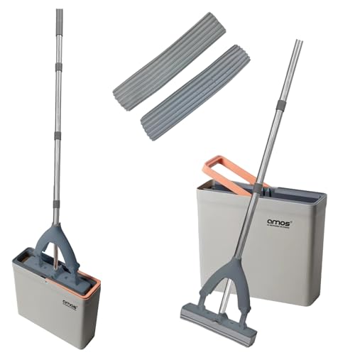 AMOS Self-Cleaning Sponge Mop and Bucket Set with 3X Super High Absorption Sponge Heads, Adjustable Height Suitable for All Hard Floors Lightweight with Carry Handle