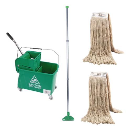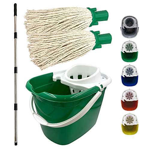 Abbey Professional Mop and Bucket Set Heavy Duty with Wringer and Two Traditional Cotton Mop Heads for Cleaning Floors – Strong Aluminum Mop Handles – Mop Bucket Capacity 12L with Pouring Lip (Green)
