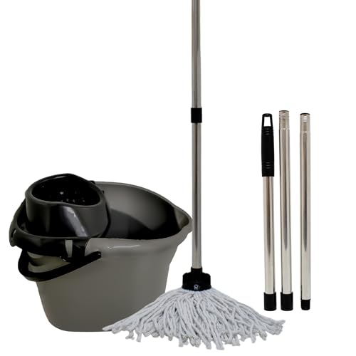 KMJ Gray Heavy Duty Mop and Buckets Sets with Detachable Wringer- Classic Plastic Mop and Bucket- Sturdy Plastic Buckets and Floor Mops- Super Absorbant Microfibre Cotton Mop with Steel Pole