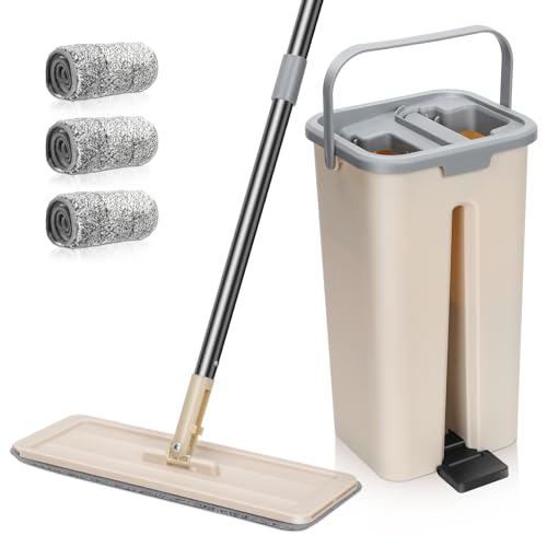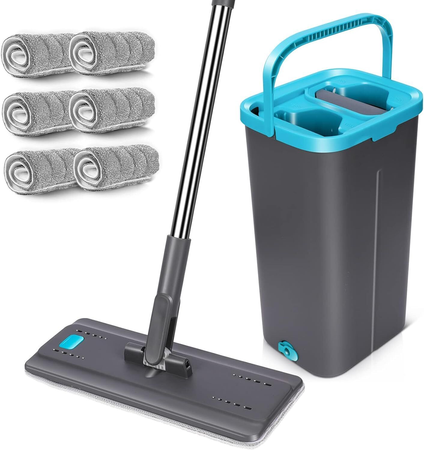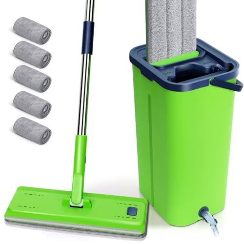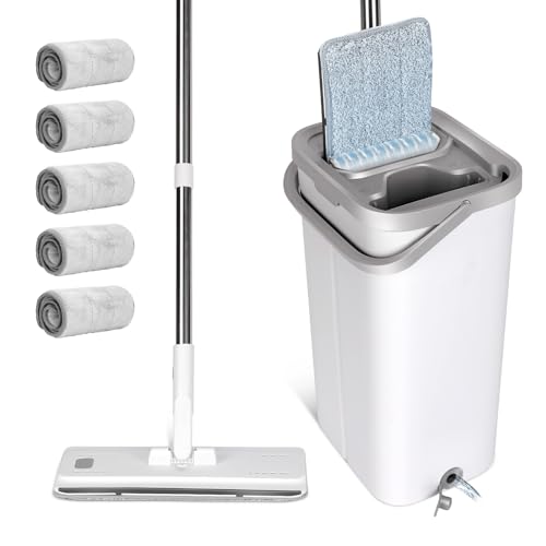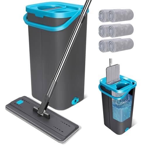 MASTERTOP Mop and Bucket, Hands Free Flat Mop and Buckets Sets with Wringer, Wet and Dry Squeeze Floor Mops with 6 Replacement Mop Pads, Compact Cleaning System, Mops for Cleaning Floors