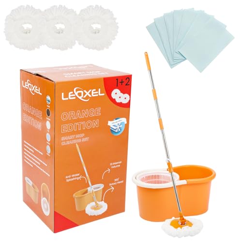 360° Spin Mop for Hard Floor – Cleaning Mop and Buckets Sets System with Easy Wring, 3 Reusable Microfibre Mop Heads & Extra 30 Wipes – For Hardwood, Tile, Laminate, Vinyl Floors – Orange
