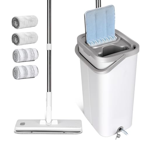 Masthome Flat Mop and Buckets Sets,Floor Mop and Bucket with 4 Reusable Pads,140cm Retractable Handle Microfibre Washable Mops wtih 360° Swivel Head for Laminate, Tile, Hardwood Floors