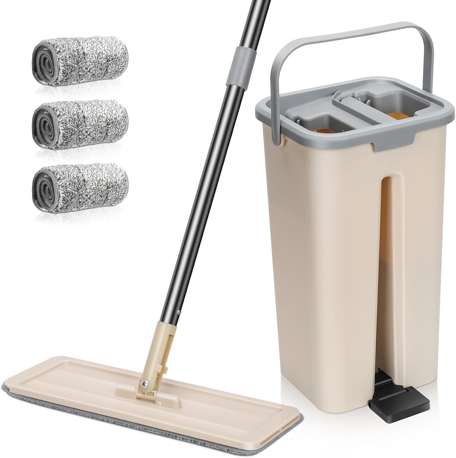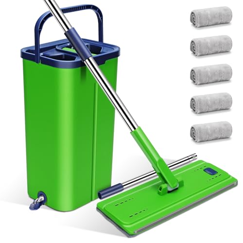 MASTERTOP Mop and Bucket, Hands Free Flat Mop and Buckets Sets with Wringer, Wet and Dry Squeeze Floor Mops with 6 Replacement Pads, Compact Cleaning System, Mops for Cleaning Floors