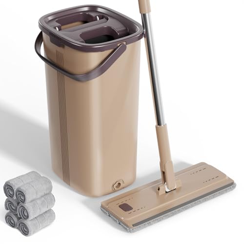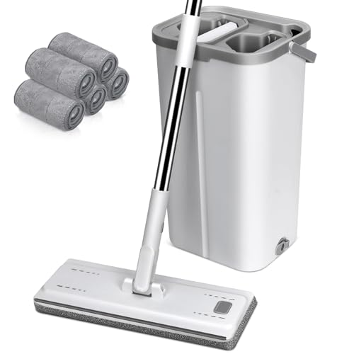 MASTERTOP Mop and Bucket, Hands Free Flat Mop and Buckets Sets, Squeeze Floor Mop with Bucket Wringer, Send 6 Wet and Dry Pads, Floor Cleaning System for Hardwood Laminate Tile Walls Baseboards