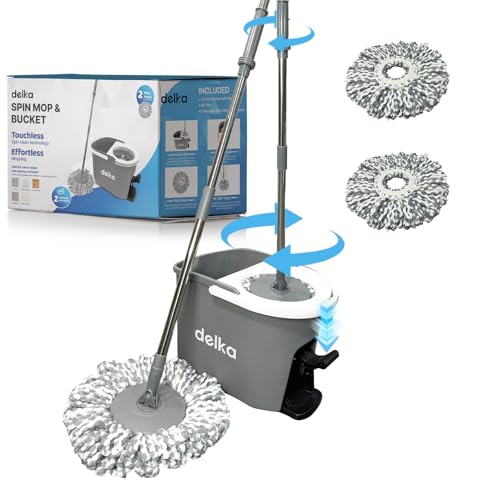 delka Spin Mop and Bucket Set – Easy Foot Pedal Water Removal, 360° Swivel Motion, Includes 2 Microfibre Mop Heads, All-Surface Cleaning, Splash Guard for Clean Mopping – Mop and Buckets Sets