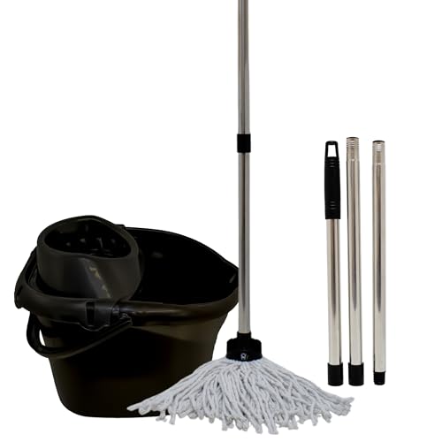 KMJ Black Heavy Duty Mop and Buckets Sets with Detachable Wringer- Classic Plastic Mop and Bucket- Sturdy Plastic Buckets and Floor Mops- Super Absorbant Microfibre Cotton Mop with Steel Pole