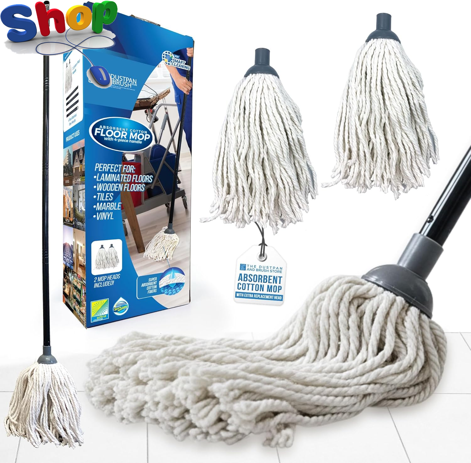 LSC Cotton Floor Mops Looped String Mop with 120cm Long Stainless Steel Handle Extra Replacement Mop Head Scratch-Free Absorbent Classic for Tile Wood Floor Kitchen Bathroom