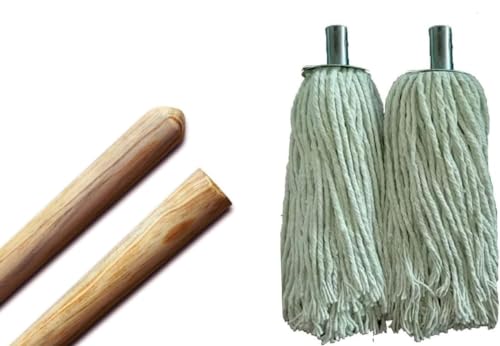 Best House 2 Pcs Pine Wood Mop Stick, Handle for Mop Head - (1.2 Metres x 22mm) + 2 Pcs Cotton 14 Ply Metal Socket Mops Head - 250g for Floor Cleaning/Sweeping in Home/Office