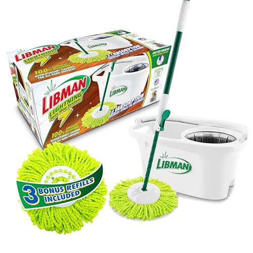 Libman Lightning Spin Mop System Plus 3 Refill Head | Mop and Bucket with Wringer Set | Floor Mop | Spin Mop | Libman Mop | Mops for Floor Cleaning | Hardwood Floor Mop | 4 Total Mop Heads Included