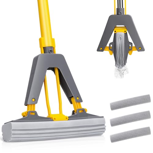 Nolopau Sponge Mop, Self Squeeze, Stainless Steel Handle, 3 PVA Absorbent Mop Heads, Yellow, Floor, 50.3 Inch Length