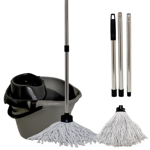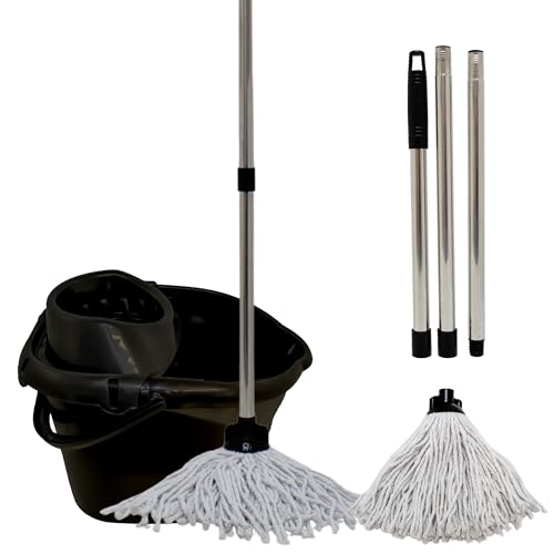 KMJ Black Heavy Duty Mop and Buckets Sets (2 Mop Heads & 1 Steel Pole) with Detachable Wringer-Classic Plastic Mop and Bucket-Sturdy Plastic Buckets & Floor Mops-Super Absorbant Microfibre Cotton Mop