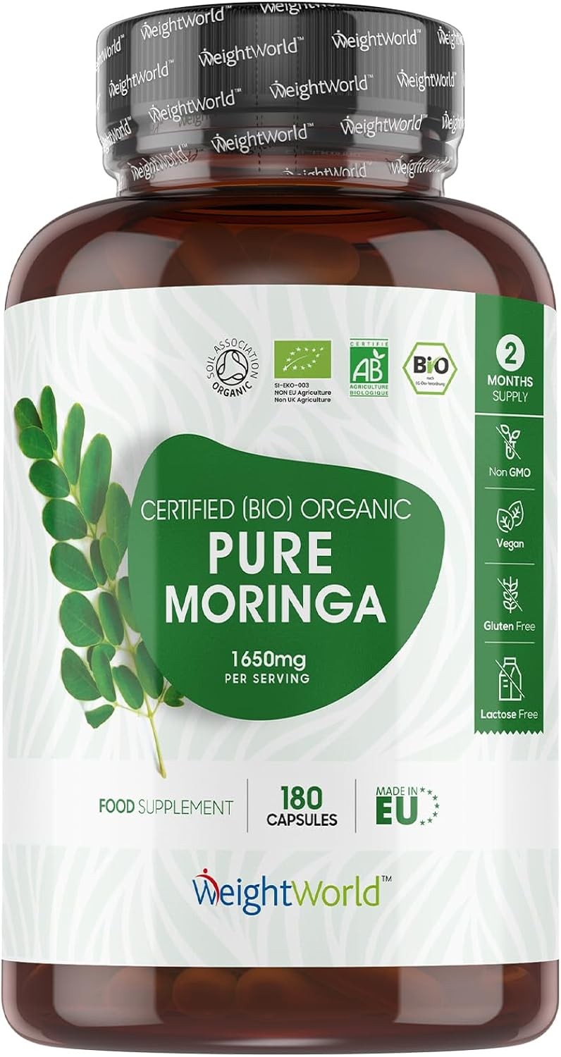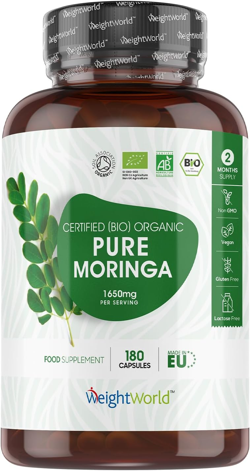 WeightWorld Organic Moringa Capsules | 1650mg | 180 Vegan Capsules | 2 Months Supply | Soil Association Certified | Bio-Organic Pure Moringa Powder Supplement | Gluten-Free, Non-GMO & GMP-Approved