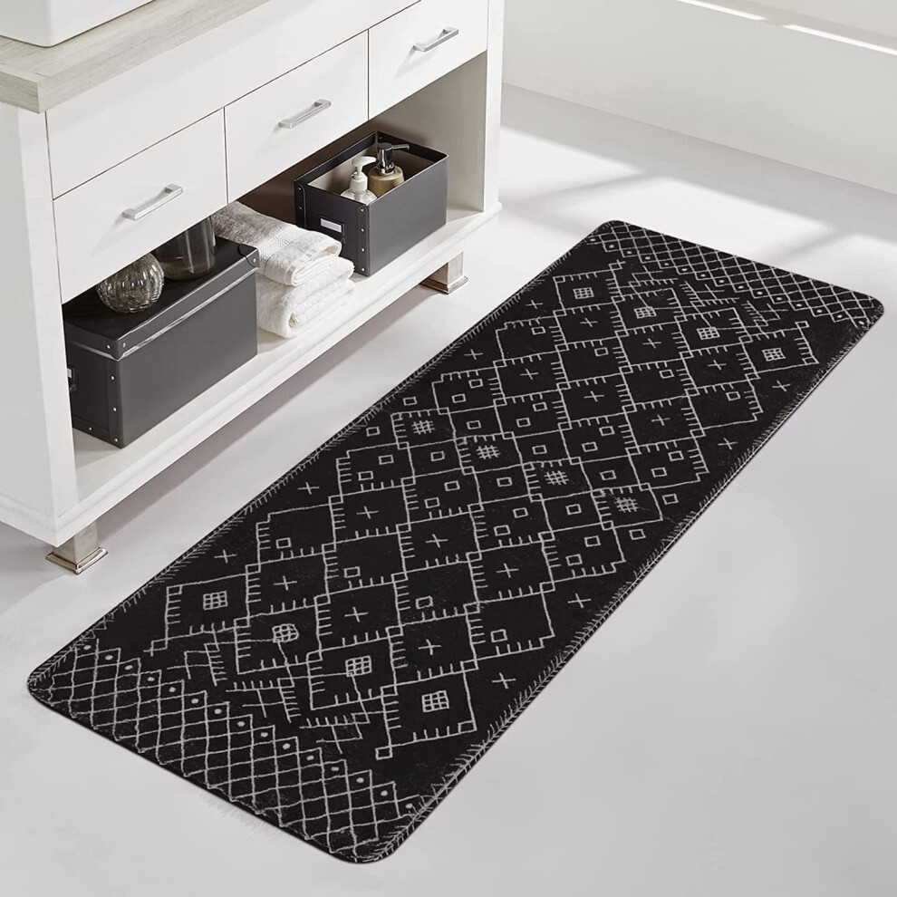 20x59in Black Boho Geometric Bathroom Runner Rug, Non-Slip Moroccan Farmhouse Bath Mat, Soft Velvet, Machine Washable