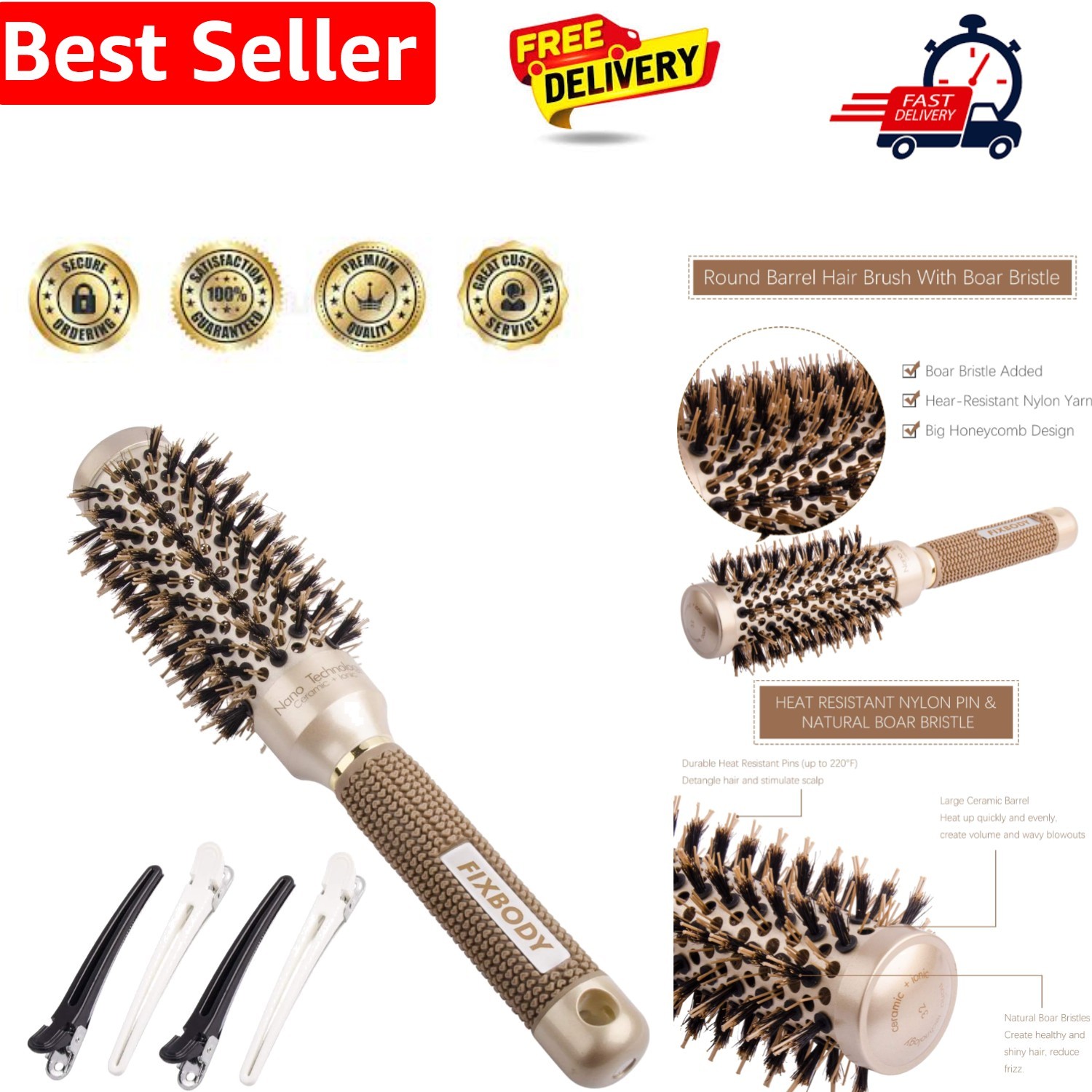 Beauty Carves 53mm Thermal Ceramic Round Hair Brush with Nano Ionic Barrel & 2 C
