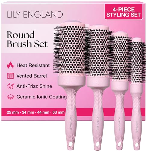 Lily England Professional Round Brush Set for Styling - 4 Ceramic Ionic Round Brushes for Blow Drying Hair - Pink