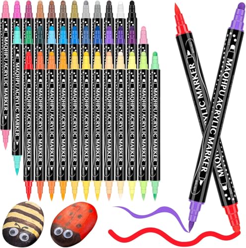 Maqhpu Acrylic Paint Pens, Arts and Crafts for Kids, 24 Colours Dual Tip Acrylic Markers for Rock Painting Stone Glass Ceramic Wood Metal, Round & Brush Tip Water Based Acrylic pens