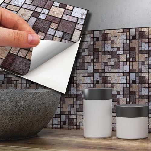 WALPLUS 48 PCS 15cm (6") Metallic Brown Marble Mosaic Tile Stickers | Peel and Stick Self-Adhesive Wall Tiles for Kitchen & Bathroom Backsplash or Tile Upgrade