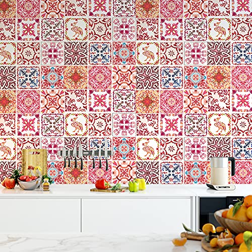WALPLUS 15cm(6") 24 pcs Moroccan Rose Red Mosaic Wall Tile Stickers Peel and Stick Backsplash Self-Adhesive Vinyl Home Decoration DIY Living Bedroom Splashbacks for Kitchen Tile Paint Stick on Tiles