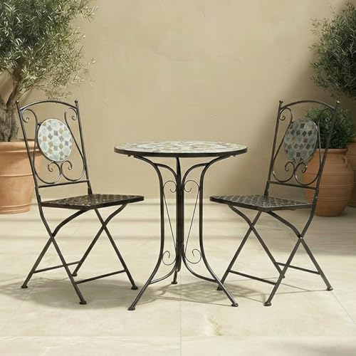 YuuSsea Mosaic Bistro Set, Blue/White, Iron & Ceramic, Foldable, 1 Table, 2 Chairs, Garden, Balcony, Patio, Max. 110 kg per Seat