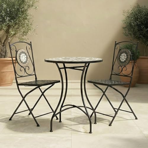 CHARLES BENTLEY Garden Black Mosaic 3 Piece Dining Set, With Folding Chairs, Outdoor, Patio, Conservatory, Foldable Chairs, Antirust Finish, Interwoven Seat, 2 Person, Round Table, Robust (65x65x72cm)