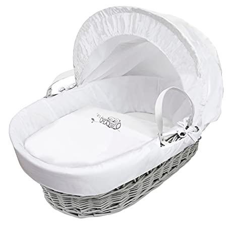 ELEGANT BABY White Teddy Wash Day Grey Wicker Moses Basket with Full Bedding Set, Adjustable Hood, Fibre Mattress & Padded Liner