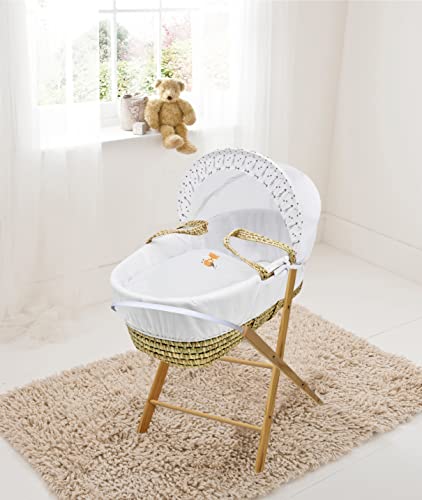 Kinder Valley Embroidered Fox Palm Moses Basket with Natural Folding Stand, Adjustable Hood, Fibre Mattress & Padded Liner
