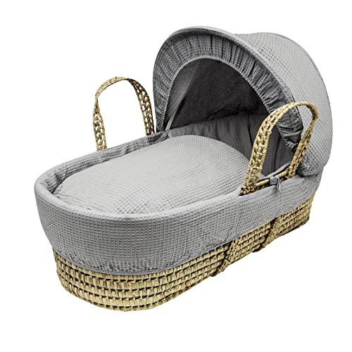 Kinder Valley White Waffle Grey Wicker Moses Basket with Full Bedding Set, Adjustable Hood, Fibre Mattress & Padded Liner