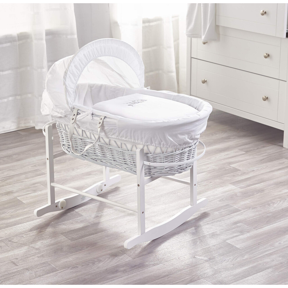 ELEGANT BABY Embroidered Sleepy Owl White Wicker Moses Basket with Chester White Rocking Stand, Adjustable Hood, Fibre Mattress & Padded Liner