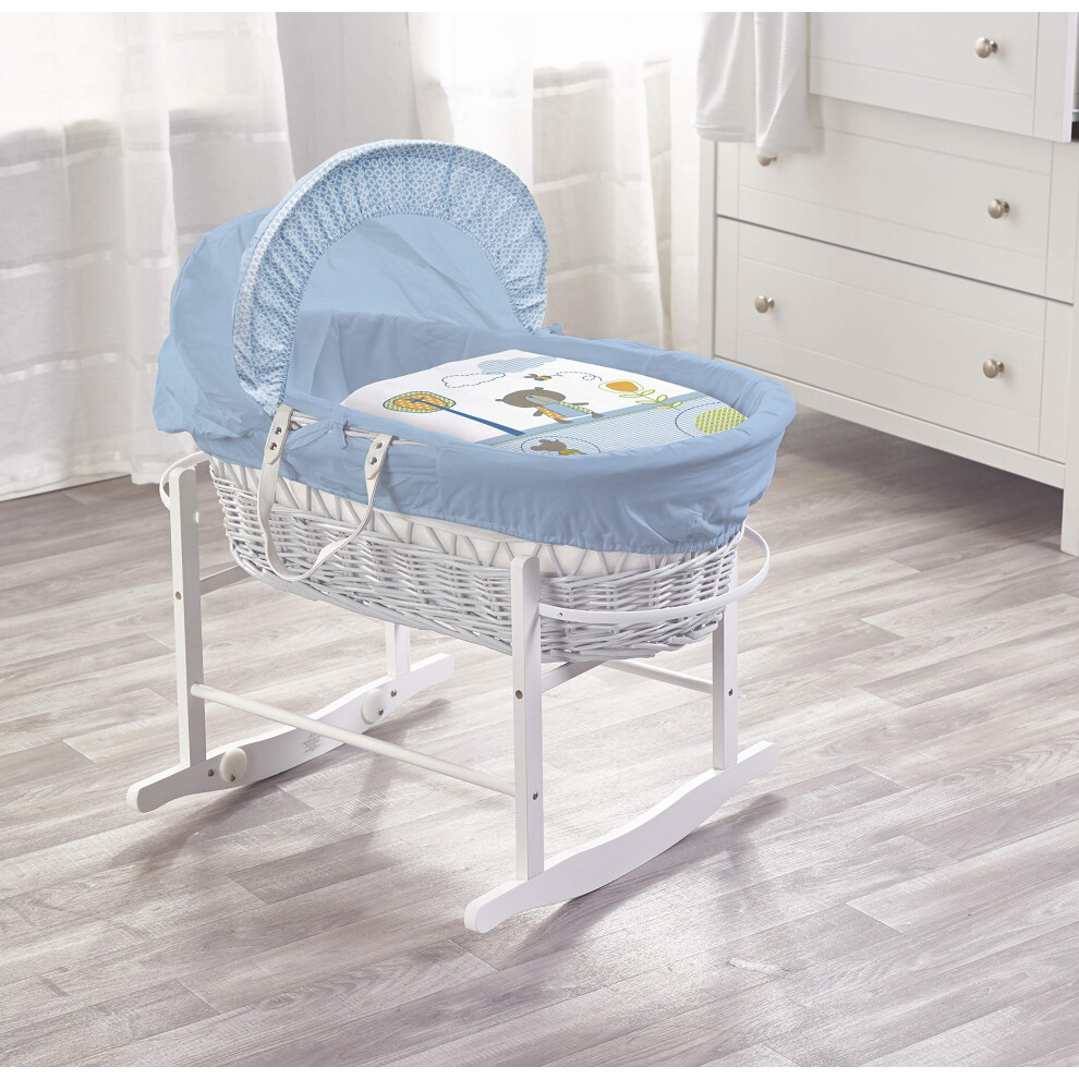 ELEGANT BABY Kinder Valley Beary Nice Blue White Wicker Moses Basket with White Rocking Stand, Adjustable Hood and Padded Liner