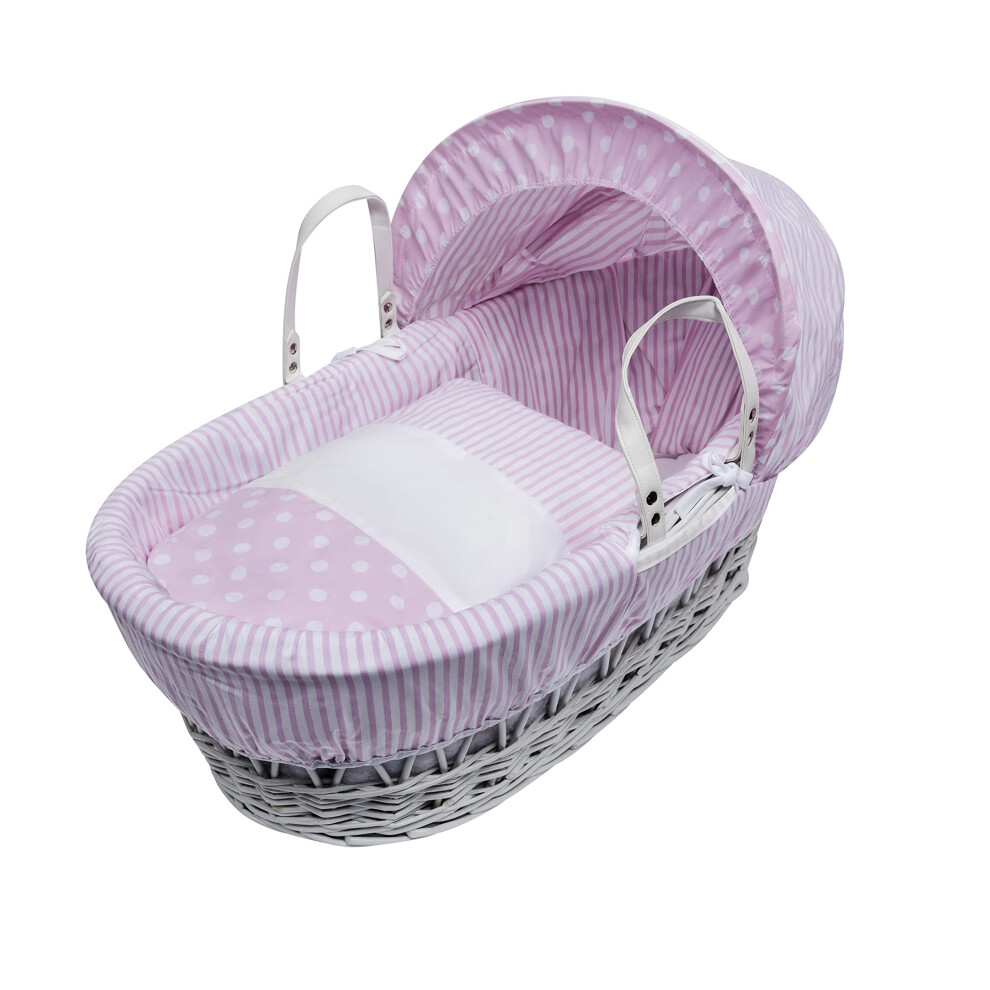 ELEGANT BABY Palm Moses Basket with Full Bedding Set, Adjustable Hood, Fibre Mattress & Padded Liner (Pink Spots & Stripes Wicker)