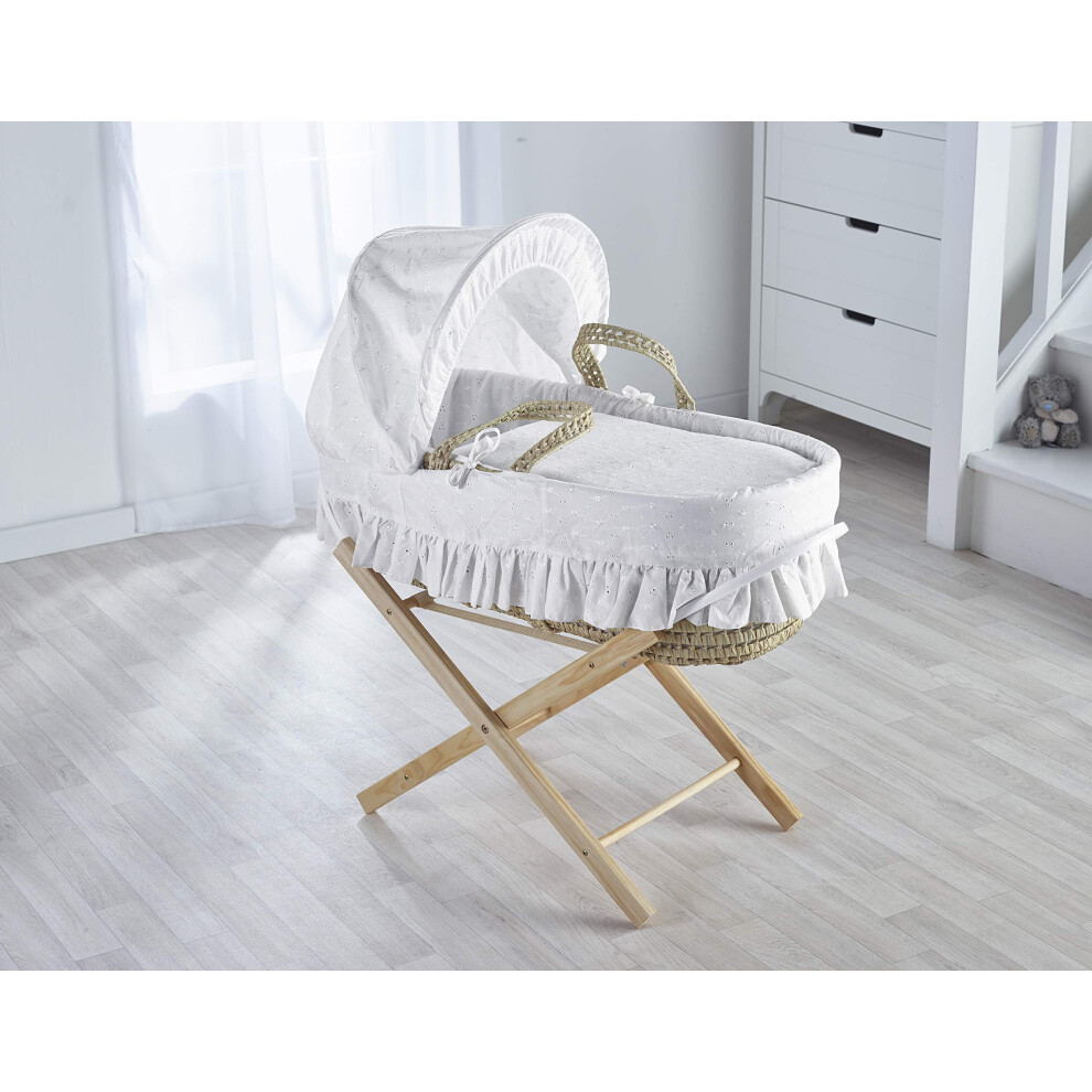 ELEGANT BABY Broderie Anglaise White Palm Moses Basket with Natural Folding Stand, Adjustable Hood, Fibre Mattress & Padded Liner