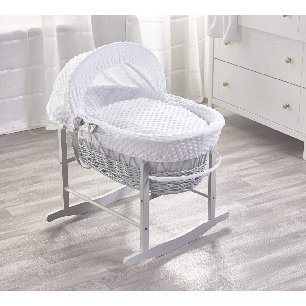 ELEGANT BABY White Dimple Grey Wicker Moses Basket with Chester Grey Rocking Stand, Adjustable Hood, Fibre Mattress & Padded Liner