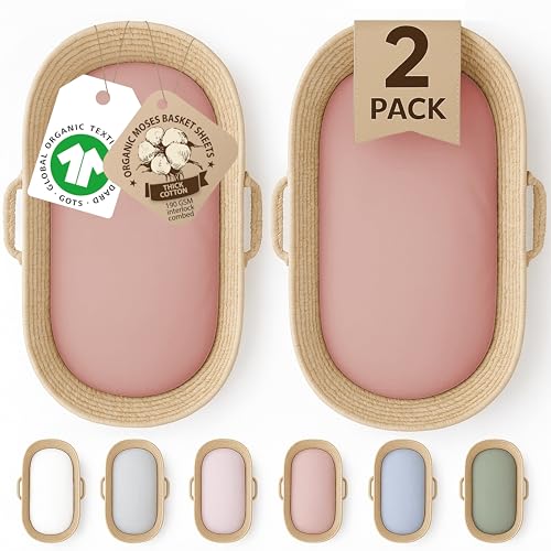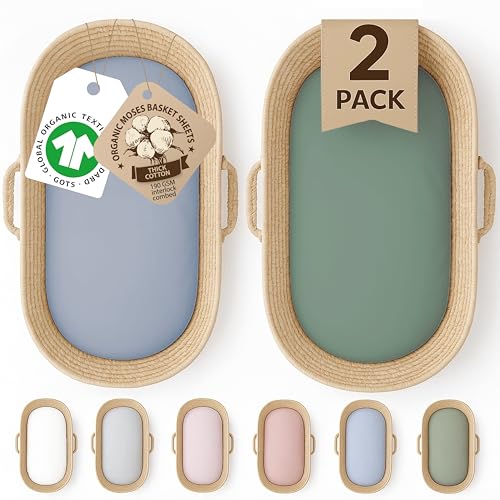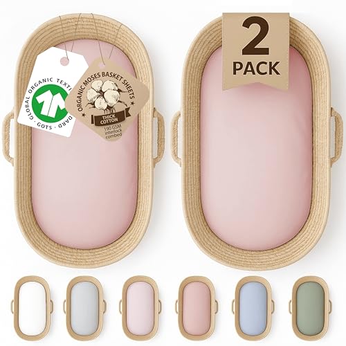 GOTS Organic 2 x Moses Basket Fitted Sheets 74x30 - GOTS Organic Cotton - 190GSM Thick & Cozy Cotton Fits Ovale | Paml & Wicker Moses Baskets Fits Also 28x74cm